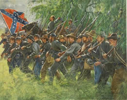 He rejoined Lee’s Army of Northern Virginia after its return from Gettysburg, earning great distinction for valor at the Battle of Bristoe Station. He then assumed brigade command after the wounding of General William W. Kirkland (of Hillsboro) at Cold Harbor in 1864--- with a temporary rank of brigadier general. Kirkland had served previously as colonel of the 21st North Carolina, and had assumed command of the brigade after the death of General James Johnston Pettigrew (of Washington County) in the aftermath of Gettysburg. The brigade is known in War Between the States history as the "Pettigrew-Kirkland-MacRae" brigade. The new "MacRae" brigade now commanded consisted of the 11th, 26th, 44th, 47th and 52nd North Carolina Infantry regiments which had already achieved fame under Pettigrew, but under MacRae’s leadership they were to become an exceptionally-disciplined fighting unit with a stern and able leader. A Glorious Victory---The Battle of Ream’s Station: On August 25, 1864, the three brigades of North Carolinians under Generals Lane, Cook and MacRae were concentrated in a wooded area opposite the right flank of Northern forces. MacRae had told his men that he knew they would go over the enemy works, and that he wished them to do this without firing a gun. The artillery fire of (Col. William J.) Pegram swept the enemy forces before the brigades advanced late in the afternoon, charging up to the Northern earthworks and fighting hand to hand---ending with a full rout of the enemy. MacRae had instructed Lt. W.E. Kyle, and his sharpshooters to concentrate upon the Northern artillery batteries firing at his forces, thus eliminating this threat. Once captured, the guns were turned upon the fleeing enemy by Captain W.P. Oldham of Wilmington and his men of Company K of the 44th North Carolina who opened an accurate and devastating fire.
